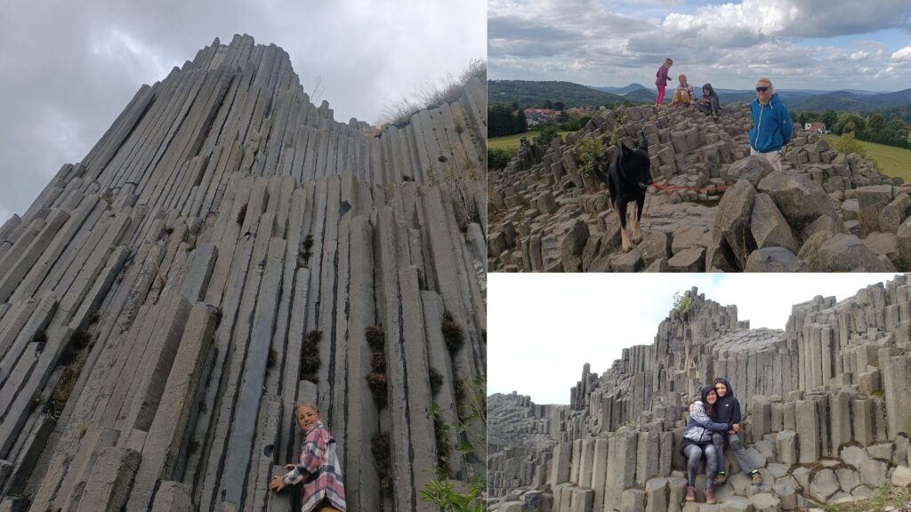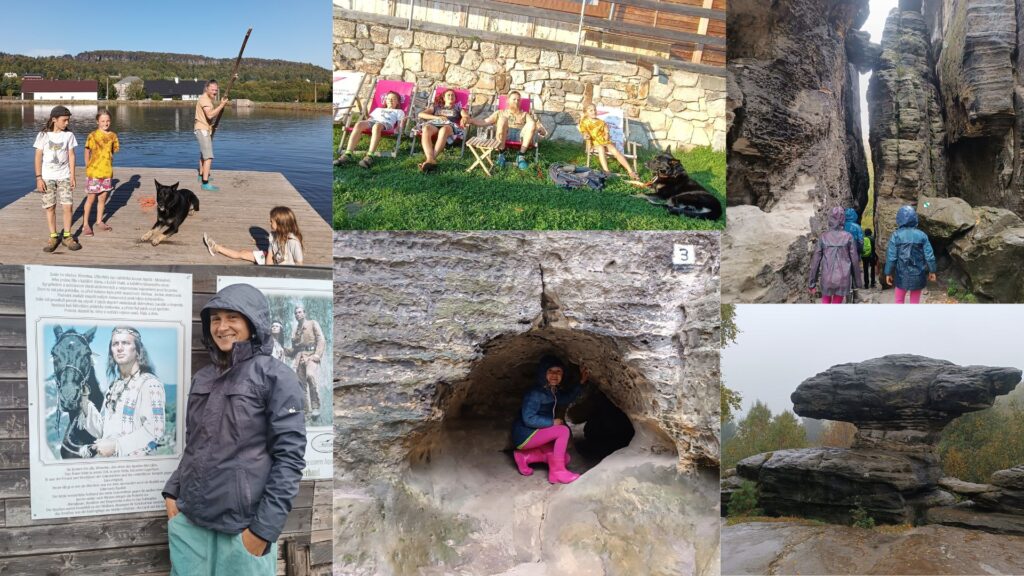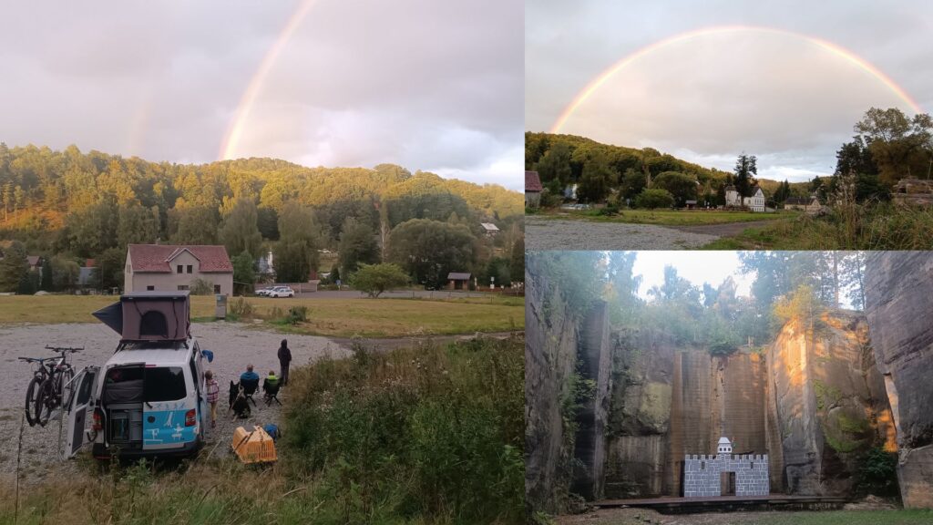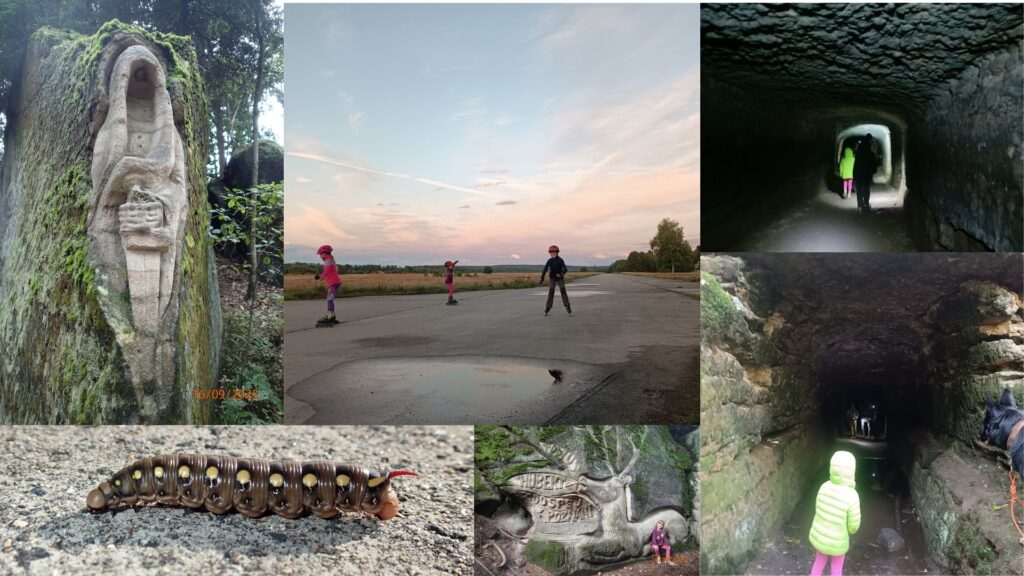 Jeden super nabytej den začal na parkovišti u bývalého letiště u Mimoně. Po snídačce jsem s dětma obula in-liny a šli jsme objet letiště s výhledem na Ralsko. Hombre s Ragim si dali výběh na vyhlídku nad Hradčanama. Potkali jsme krásnou housenku a jednu pasoucí se krávu. Pak jsme dali obědovou zmrzku v Mimoni a jeli dál do galerie v lese, kde jsme hledali sochy. Moc hezká procházka, tak akorát dlouhá. Dobrodrůžo přišlo potom, kdy jsme v obci Svitava nechali auto a šli prozkoumávat jeskynní chodby a průchody. Na tento výlet jsem našla tip zde: https://bohousakarel.blogspot.com/2019/05/jeskynarem-snadno-rychle-svitava.html a musím říct, že to bylo fakt dobrý. Naši malí dobrodruzi měli chvílema trošku v gatích. Stavujeme se ještě kouknout na skalní útvar Pusté kostely a jedeme severně se zastávkou na Panské skále. Tu zná asi každej, ale je to fakt pěkný místo a možnost tam po tom všude lézt nás moc baví. Tenhle večer parkujeme na Stellplatze v Prysku. Na první pohled nic moc, ale po prozkoumání místa jsme nadšení. Krásný vyhlídky kolem vesnice, veřejné ohniště, otevřené koupaliště (jsou mezi námi 2 otužilci), na kterém i v mimosezóně seženete hranolky, divadlo uprostřed lesa ve skále (moc si přeju sem někdy na něco jít), zastávka s knihobudkou. Je to prostě místo, na kterém jsme cítili ,, genius loci,, . A ta duha! Místní domorodci se tam o vše moc krásně starají. Ač bylo parkování zdarma a platba dobrovolná, tak jsme moc rádi přes QR kód něco přispěli.