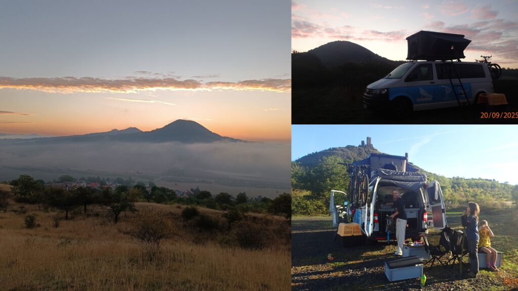 Další oblast, která nás nadchla je celé České středohoří. Ty sopečný kopce mají svý veliký kouzlo. Trochu nám to připomnělo Toskánsko, akorát místo olivovníků byli ořešáky, jabloně a vinná réva. A ty východy slunce! A ty západy slunce! Šli jsme zde naší první hřebenovčičku s dětmi. Trek Oblík – Srdov – Brník. Nic náročnýho a moc hezký. Nejvíc se mi líbí vrcholy těch kopců – žádný kříže, žádný kaple, jen krásný výhledy. Na Oblíku je vyznačen energetický bod a na Srdově jsou krásný keramický sošky. Já nevím kdo je autor/ka, ale děkuju, to místo je díky Vám krásnější. Takhle vkusně doplňovat přírodu je super. Nejkrásnější spot na spaní jsme měli pod Hazmburkem.